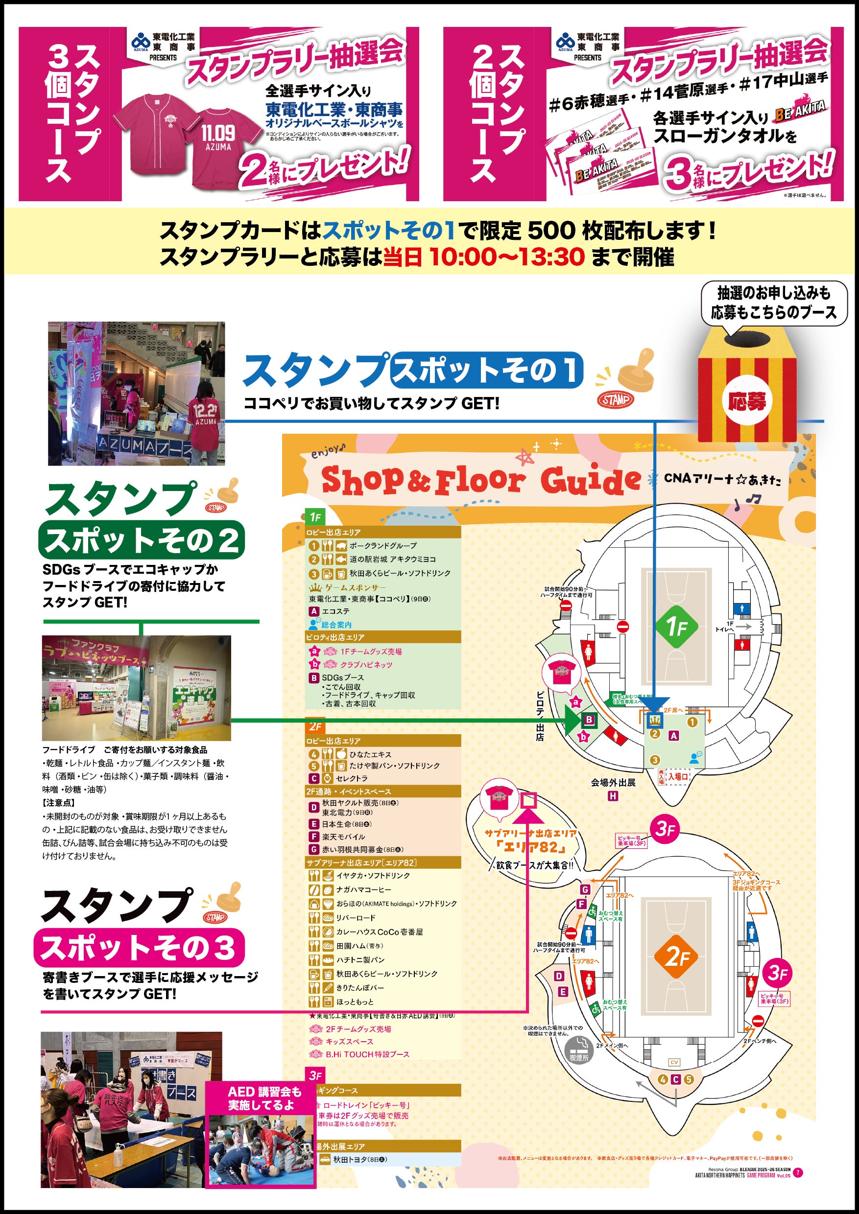 11月9日(日)群馬クレインサンダーズ戦のゲームスポンサー 東電化工業・東商事では、当日に会場を巡って集めるスタンプラリーや、美味しいりんごの販売、選手に向けた寄書きの募集、日本赤十字社秋田支部の協力のも、AED講習会を実施します。みなさんぜひ、お立ち寄りください。