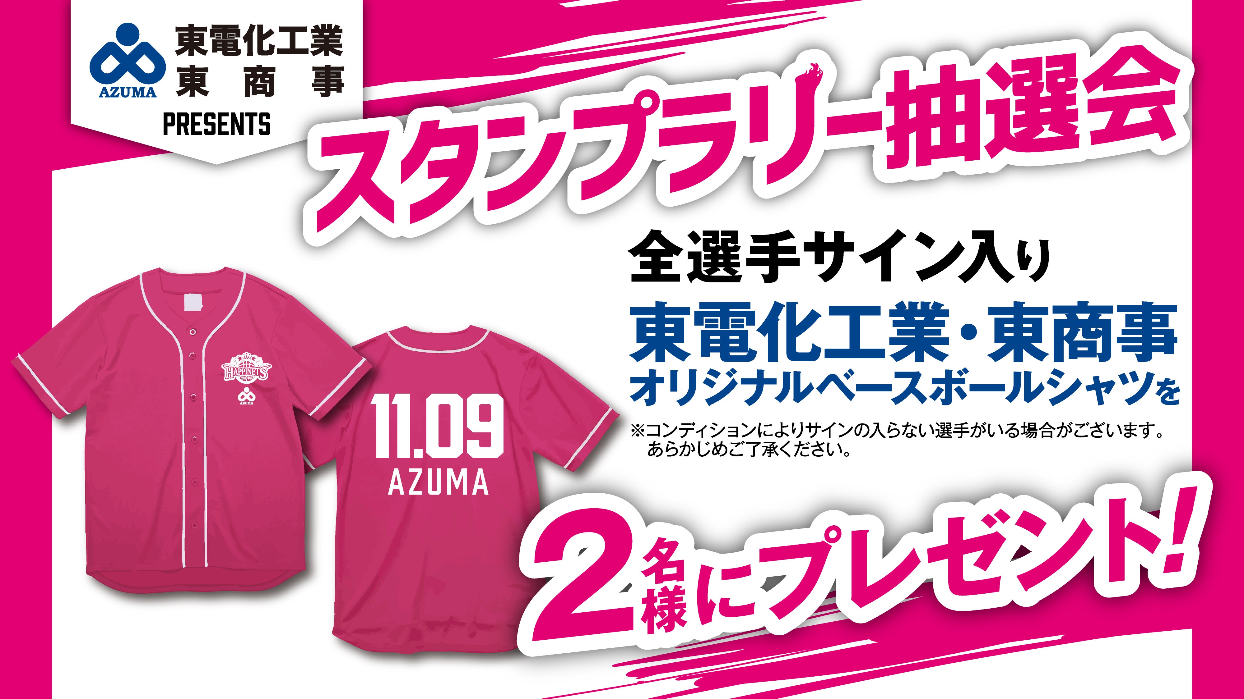 抽選で2名様に「秋田ノーザンハピネッツ全選手サイン入り東電化工業・東商事オリジナルベースボールシャツ」をプレゼント!※サインはコンディションにより入らない選手もいます。予めご了承ください。