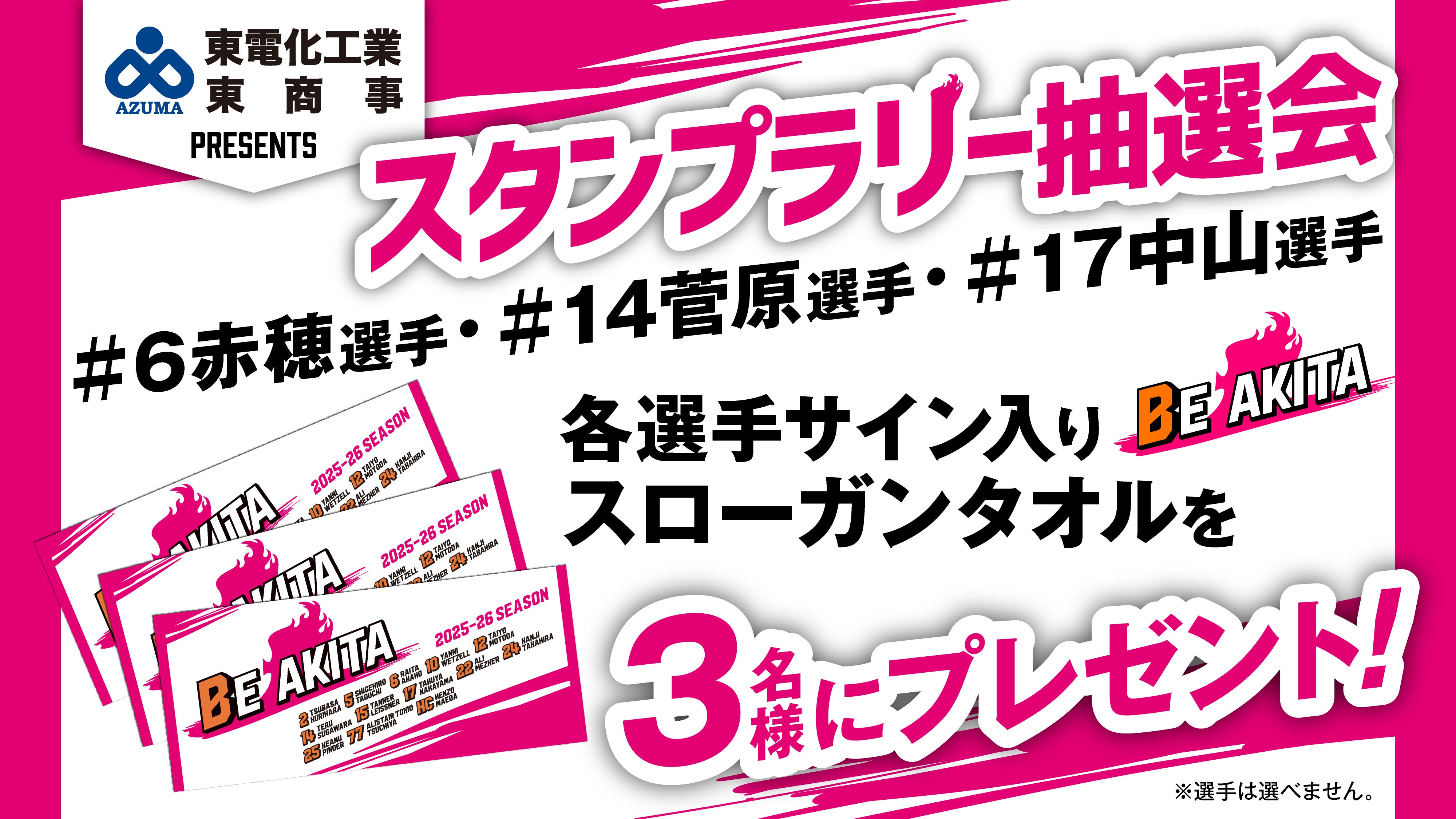 抽選で3名様に各選手サイン入り「2025-26シーズンタオル」をプレゼント! ※選手は選べません。予めご了承ください。