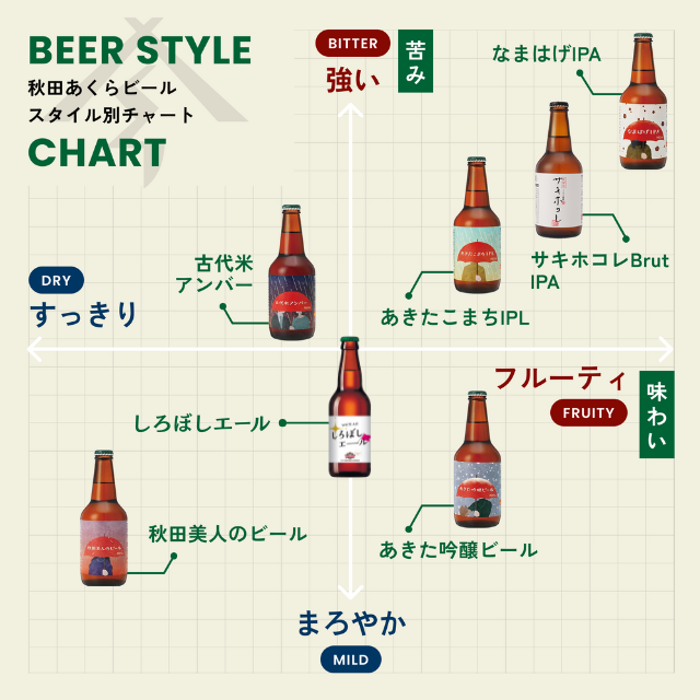 レギュラービール:秋田美人のビール、なまはげIPA、あきた吟醸ビール、あきたこまちIPL、サキホコレBrut IPA、古代米アンバー