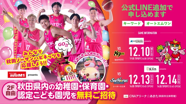 秋田ノーザンハピネッツでは、2025年 12/10(水)~12/14(日)までの秋田市内で開催される該当試合にて、秋田県内の幼稚園・保育園・認定こども園児をご招待する『オートエムワン presents 幼稚園・保育園・認定こども園児 特別ご招待企画』の実施が決定しましたのでお知らせいたします!