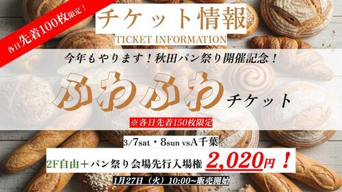 開催決定にちなみ、10:45の開場時刻よりも前に秋田パン祭りの会場への先行入場権付きの企画チケットとして、「ふわふわチケット」を各日先着100枚限定で販売いただけます。