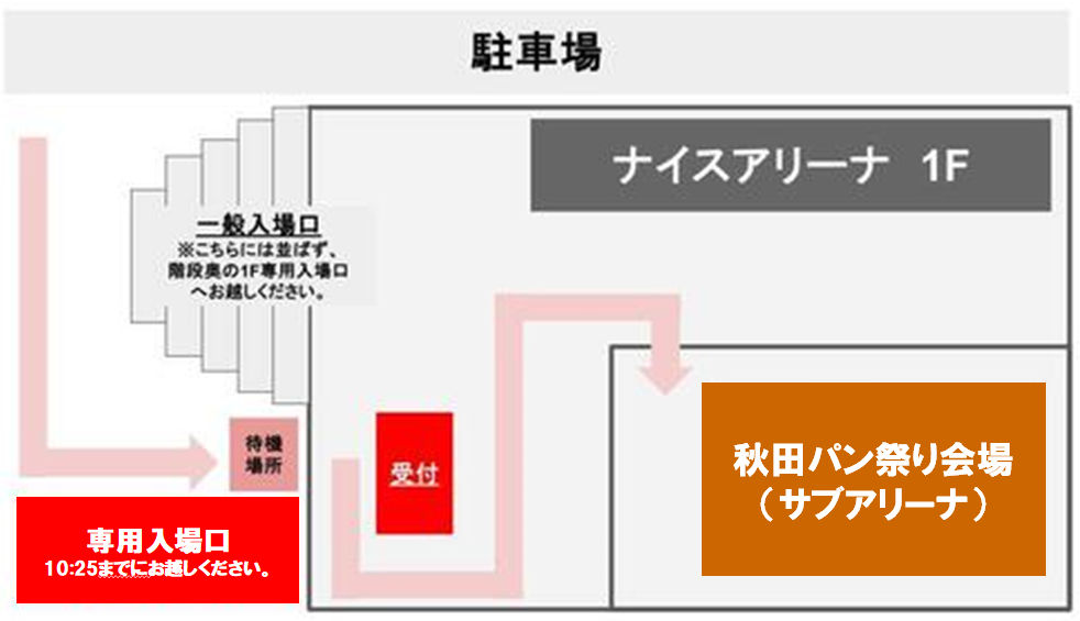 ※アリーナ内への入場並びに、その他出店等は一般入場開始後(11時目安)よりご利用いただけます。一般入場開始前は、秋田パン祭り会場内にてお待ちいただきますので、予めご了承ください。