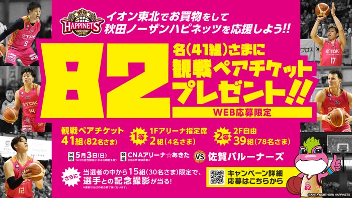 オフィシャルパートナーのイオン東北株式会社様にて、2026年5月3日(日)に行われる秋田ノーザンハピネッツホームゲーム(vs佐賀バルーナーズ)の観戦ペアチケットが41組82名さまに当たるキャンペーンを実施中です。