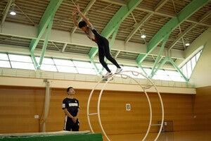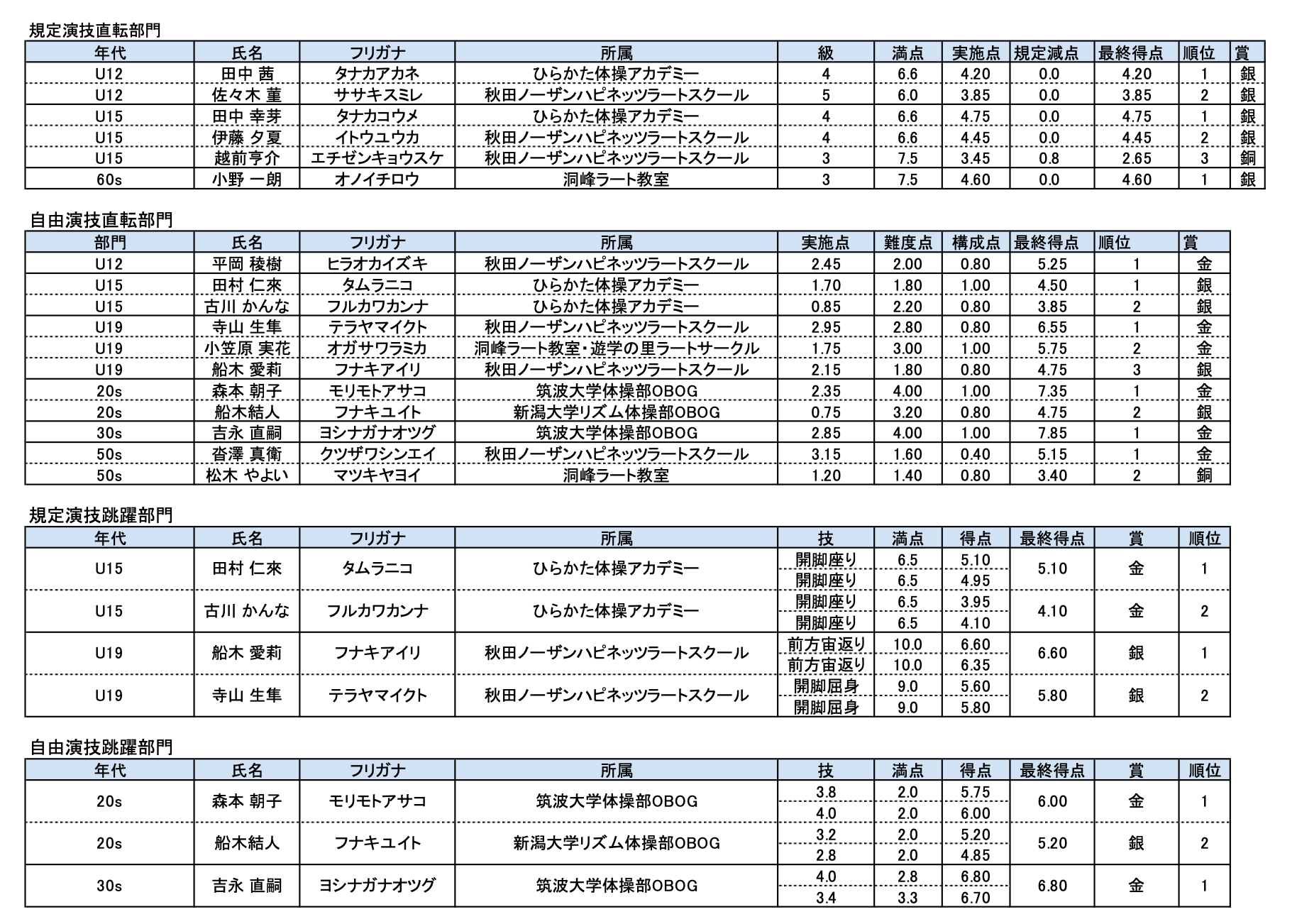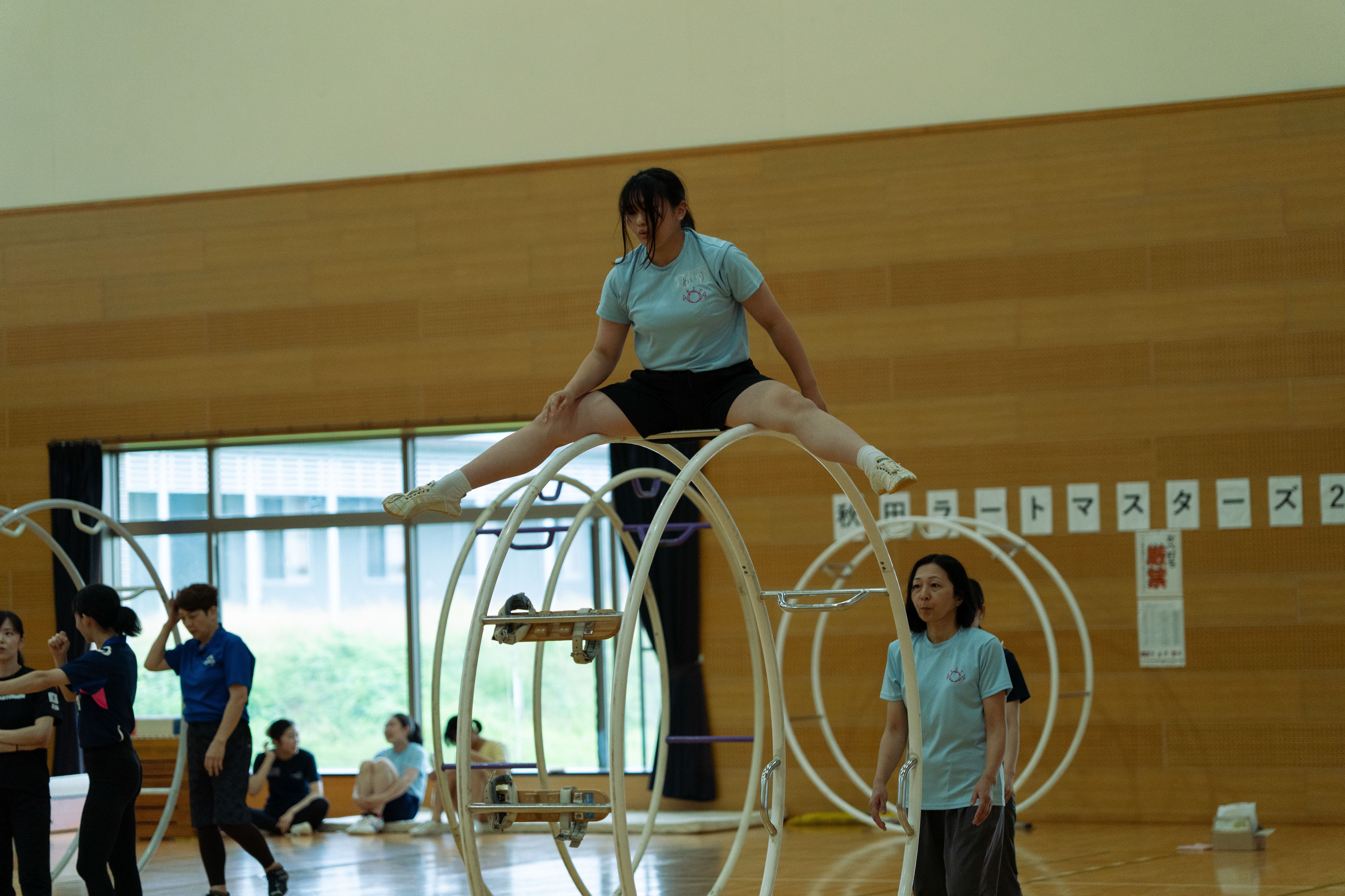 秋田ラートマスターズ2025には、大阪、茨城、千葉、東京、秋田から17名が出場し、日頃の練習の成果を発揮いたしました。今年は、新たに「規定演技跳躍」「自由演技跳躍」部門も実施し、ラートからの宙返りなどのダイナミックな演技も見られました。また、初めてラートの試合に出場する小学生の緊張感、あと少しで目標に届かず流した悔し涙、何とか演技を通し切った安堵の表情、上手く技ができた喜びなど、選手それぞれの様々なドラマも見られました。今年は全体的に演技レベルの向上が見られ、演技の点数によって決まる金賞、銀賞、銅賞の中で金賞の人数が最も多く、参加賞の争奪戦が激しくなる程でした!