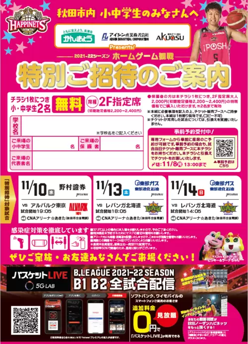 引き続き、秋田ノーザンハピネッツへの熱いご声援をよろしくお願いいたします。