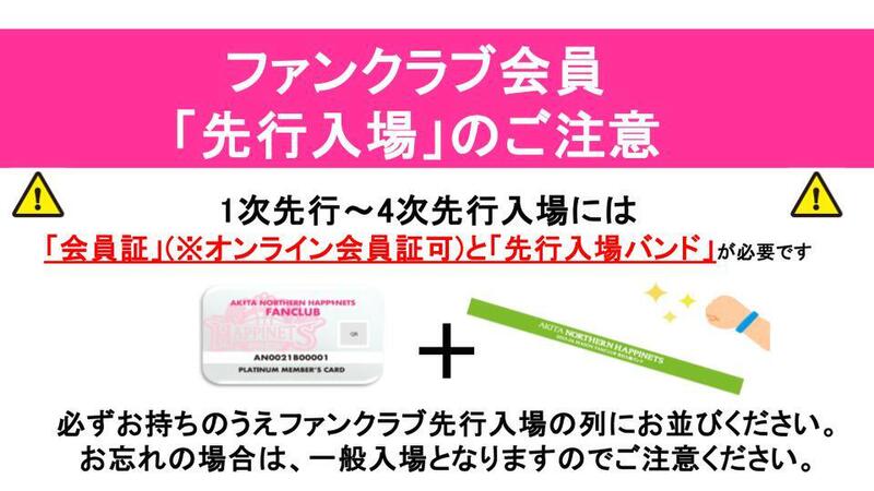 ※先行入場は「秋田市内会場のみ」です。ナイスアリーナなどの秋田市外でのホームゲームの際は、ファンクラブ会員先行入場はございません。
