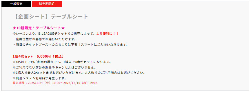 【テーブルシート】2025-26シーズン『テーブルシート』チケット販売について