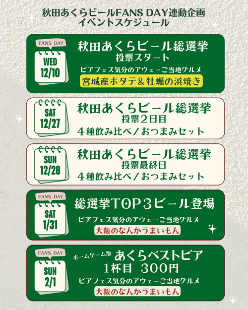 NEW GAME EVENT 2025.11.27 【秋田あくらビールFANS DAY連動企画】アリーナでビアフェス気分を楽しもう♪ いつも熱く温かいご声援をありがとうございます。 12/10(水)の次節ホームゲームは今季最初のFANS DAY! シーズン中に3試合あるFANS DAYのアリーナをさらに盛り上げたいということで、ホームゲーム会場で秋田あくらビールとの連動企画を実施することとなりましたのでお知らせいたします。 【イベントスケジュール】 各イベントの詳細は追ってお知らせいたします。 どうぞお楽しみに♪