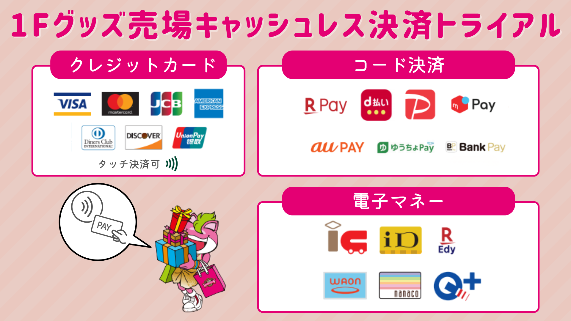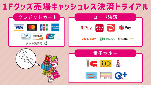 今回のキャッシュレス化トライアルに大きな支障がなかった場合、今後も1Fグッズ売場では「現金レジ1台」での運用を継続してまいります。