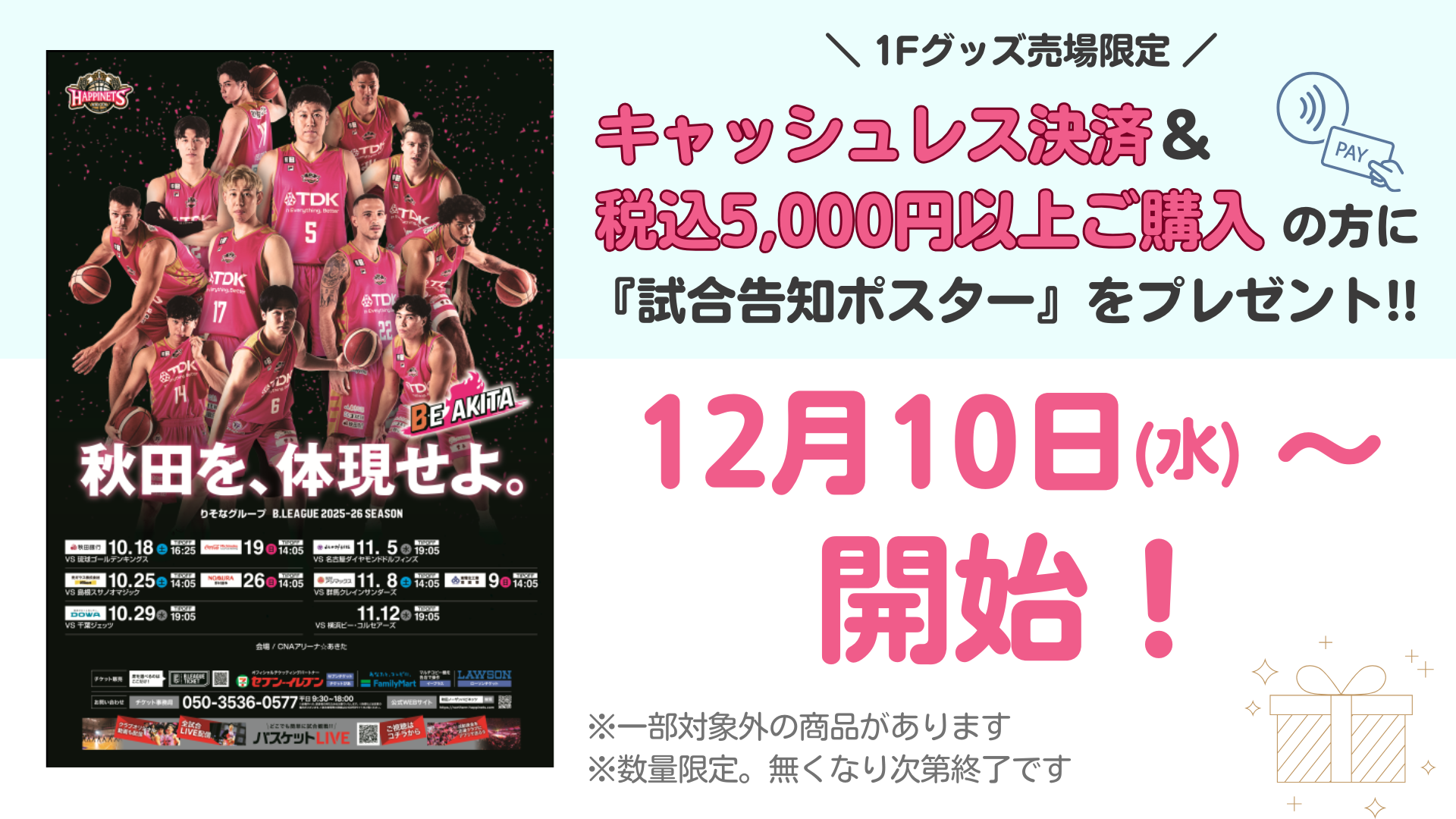12月10日(水)ホームゲーム仙台89ERS戦と12月13日(土)14日(日)シーホース三河戦では、1Fグッズ売場にてキャッシュレス決済のトライアルを実施いたします。当日、1Fグッズ売場をご利用の際は、キャッシュレスでの決済にご協力をお願いいたします。