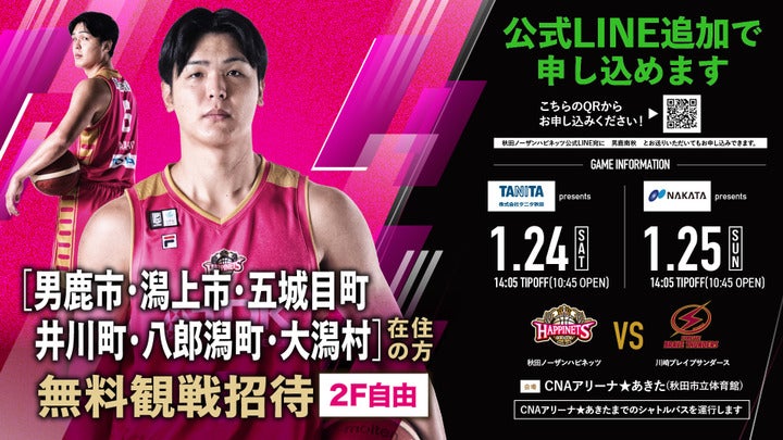 男鹿南秋地区(男鹿市・潟上市・八郎潟町・五城目町・井川町・大潟村)にお住まいの方を各試合先着200名限定で特別ご招待(無料)させていただきますので、ぜひこの機会にホームゲーム会場へご来場ください!!