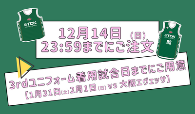 『背番号&選手名プリント』を入れて、1月31日(土)2月1日(日)3rdユニフォーム着用試合日(大阪戦)グッズ売場にてお渡し、または発送いたします。