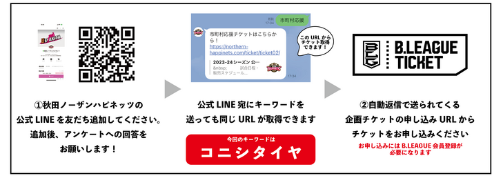 ①下記URL、またはQRコードより秋田ノーザンハピネッツの公式LINEアカウントの友だち追加を行ってください。