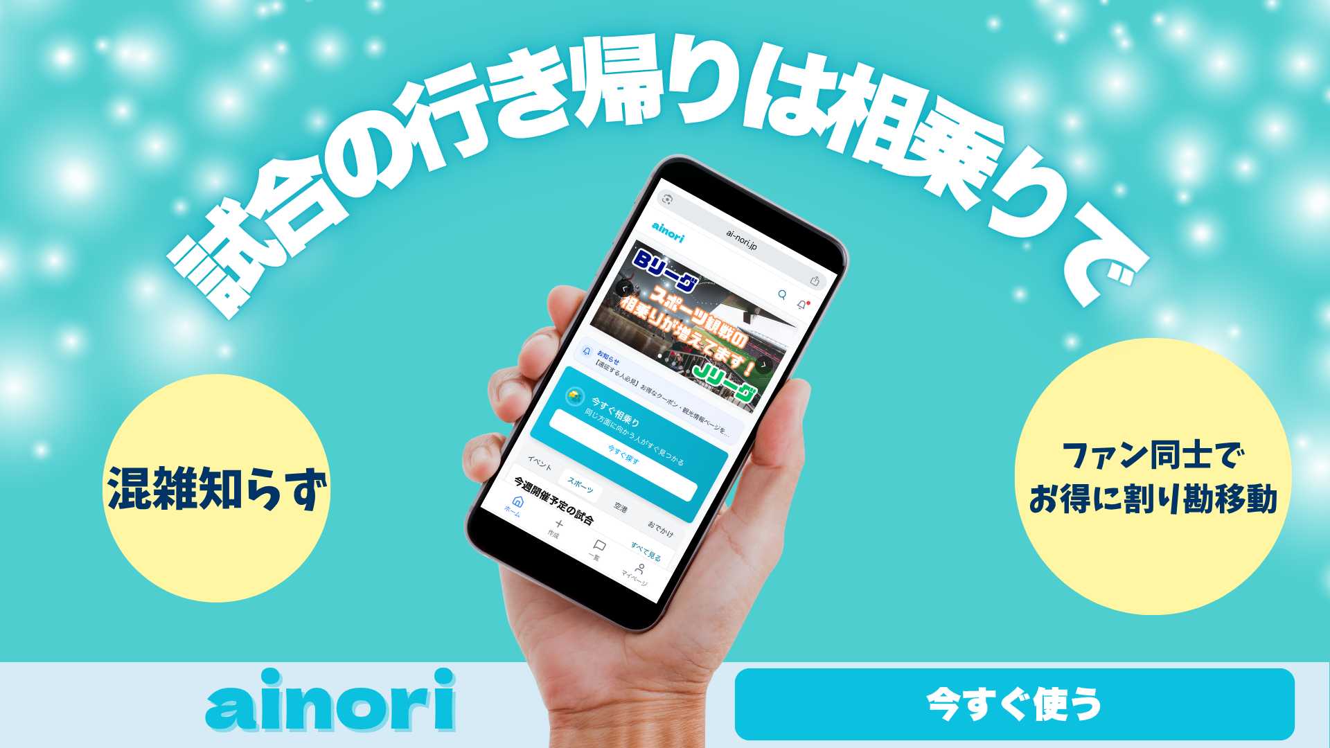 ainoriは、同じ試合に向かう人同士がタクシーを「割り勘で相乗り」して移動できるWebサービスです。アプリインストール不要のため、手軽に利用を開始することができます。