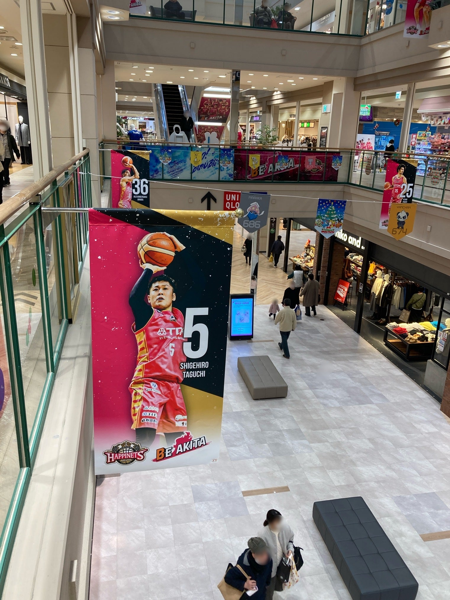 昨シーズンに引き続き、今シーズンもオフィシャルパートナーであるイオンモール秋田さまにて、秋田ノーザンハピネッツの装飾が施されました。