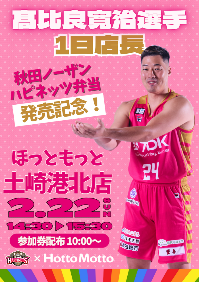 これに伴い、2月22日(日)に予定しておりました「ほっともっと土崎港北店 一日店長」のイベントは、参加選手を変更させていただきます。