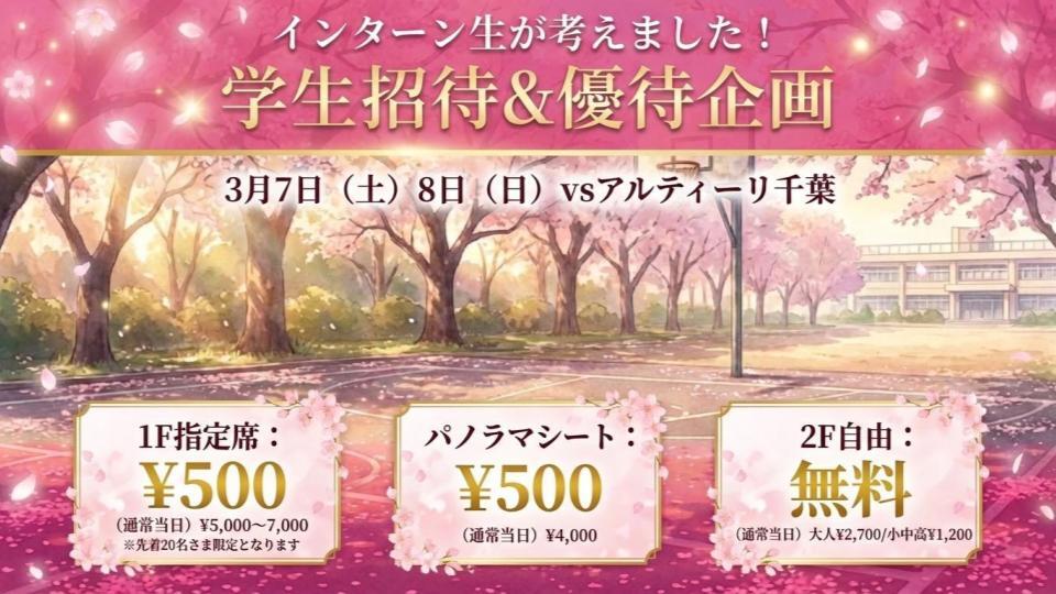 【チケット情報】インターン生が考えました!3月7日8日 VSアルティーリ千葉 学生招待&優待企画