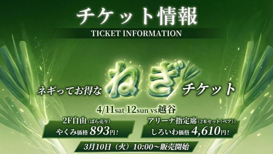 茨城戦のネバチケに次ぐ、秋田と対戦相手の越谷にゆかりのある「ねぎ」を題材としたチケットと、ゴールデンウィークを秋田ノーザンハピネッツのホームゲームで楽しむためのお得なチケットをご用意!