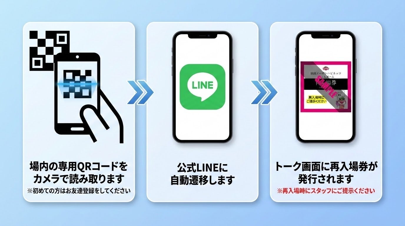 ・スマートフォンをお持ちでないお子さまや、LINEを利用されていない方のために、紙の再入場券もご用意しております。お気軽にスタッフへお声がけください。
