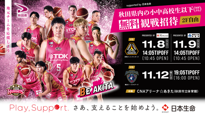 秋田ノーザンハピネッツでは、11/8(土)、11/9(日)、11/12(水)にで開催される試合にて、秋田県内の未就学児~小中高校生をご招待する『日本生命 presents 秋田県内 未就学児~小中高校生特別招待』の実施が決定しましたのでお知らせいたします!