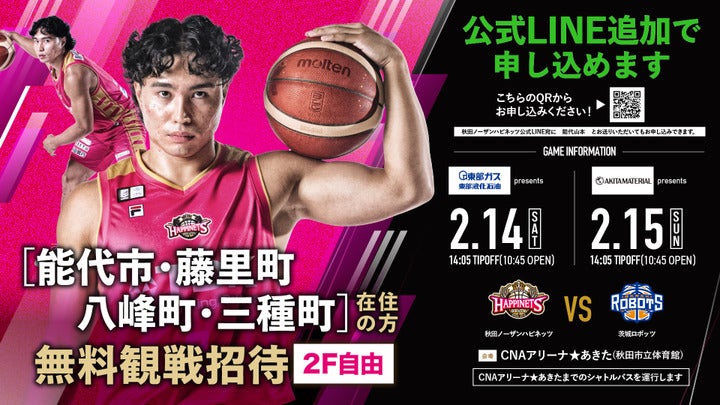 能代山本地区(能代市・藤里町・八峰町・三種町)にお住まいの方を各試合先着200名限定で特別ご招待(無料)させていただきますので、ぜひこの機会にホームゲーム会場へご来場ください!!